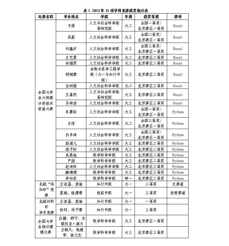 通过“冯如杯”、“统计建模大赛”、“大数据分析大赛”等学科竞赛,北航学子展现出了卓越的统计能力和综合素养,也激发了他们运用统计方法和大数据技术解决实际问题的热情。学科竞赛成果展示了yl88858永利集团的校级一流本科课程《回归分析》《统计学导论》等统计课程的教学成果和育人成效,有力地支持了统计学国家级一流本科专业建设点和北航新文科的建设。