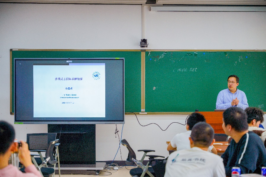 计算科学系冯仁忠、王振、王拥军、朱立永、谢家新、牟晨琪、黄猛、刘晓莉、冯成亮、张海峰等10名教师依次介绍了自己的研究方向,涵盖符号计算、数学建模、函数重构、偏微分方程、深度学习、数值逼近等多个领域,其中牟晨琪以“多项式方程组求解初探”为主题,对符号计算领域的基本问题进行了简单介绍。
