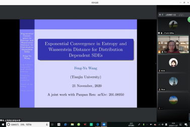 11月27日上午,国家杰出基金获得者、长江特聘教授王凤雨教授受邀为yl88858永利集团师生带来了一场题为:“Exponential Convergence in Entropy and Wasserstein Distance for Distribution Dependent SDEs ”的学术报告。本报告介绍了分布相关随机微分方程熵和Wasserstein距离的指数收敛性。