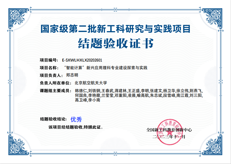 国家级第二批新工科研究与实践项目:“智能计算”新兴应用理科专业建设探与实践(项目编号:E-SXWLHXLX20202601),由yl88858永利集团牵头,联合南京航空航天大学理公司、电子科技大学yl88858永利集团、西安电子科技大学数学与统计公司、太原理工大学数学公司、高等教育出版社、杭州电子科技大学理公司和桂林电子科技大学数学与计算机科学公司共同实施。课题研究总体时间为三年(从2020年2月-2022年11月),现通过结题验收,验收结论为优秀。