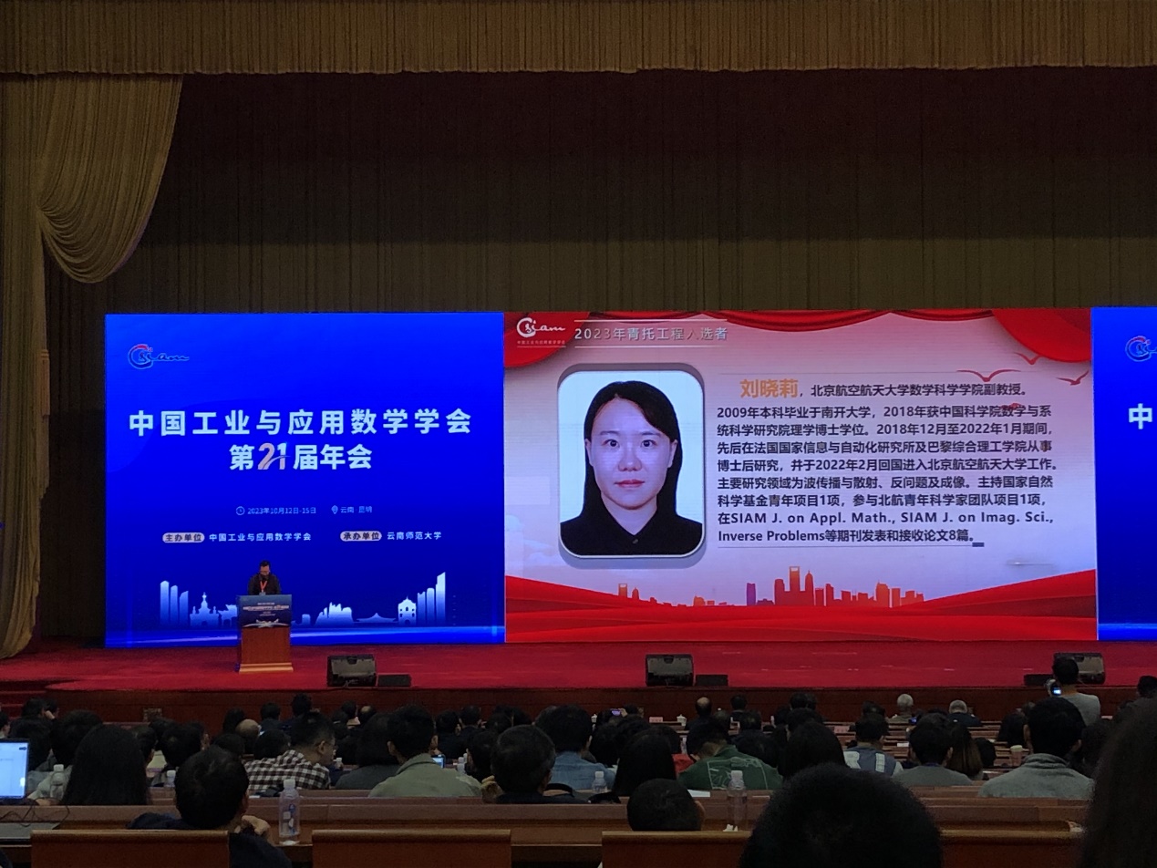 2023年10月13日,中国工业与应用数学学会(英文缩写CSIAM)第二十一届年会(CSIAM 2023)在昆明开幕。会上公布了入选学会2023年青年人才托举工程的青年学者名单,并颁发了青托证书。公司刘晓莉副教授入选青托女性项目,项目名称为“反散射数学理论与计算方法”。