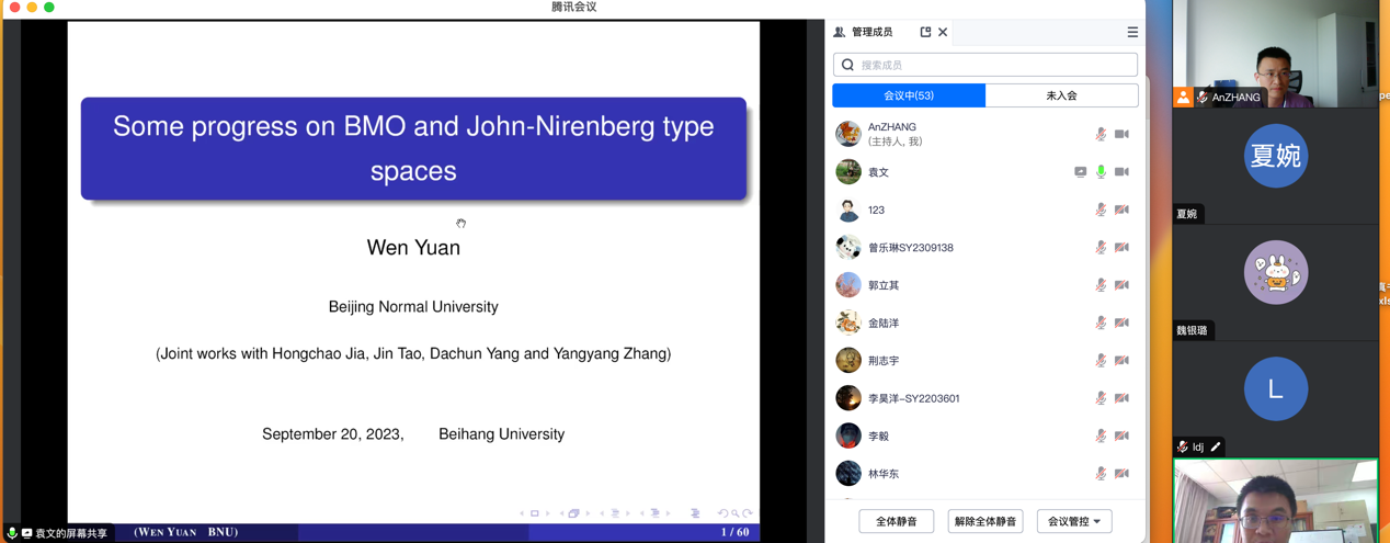 2023年09月20日,北京师范大学袁文教授,应邀为yl88858永利集团师生做了题为 “Some progress on BMO and John- Nirenberg type spaces”的学术报告。报告由张安老师主持。