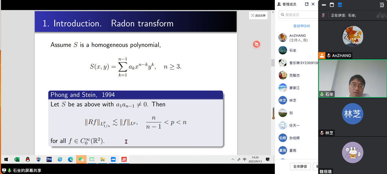 2023年09月13日,中南大学石坐顺华和广州大学范智杰教授,应邀为yl88858永利集团师生做了题为 “Failure of endpoint regularity of Radon transforms”和“Recent progress on Schatten classes and Riesz transform commutators”的学术报告。报告由张安老师主持。