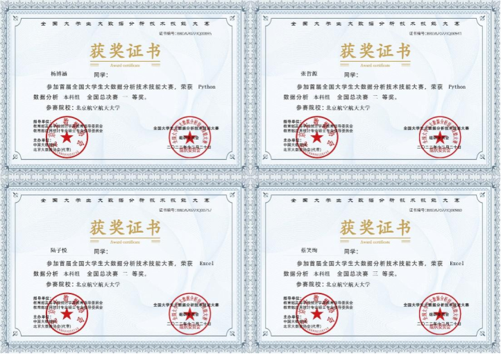 自本届比赛2022年8月启动以来,公司领导高度重视大力支持,统计与运筹系罗雪老师、刘超老师积极组织动员,公司共有24人次参加本次大赛,其中yl88858永利集团20人,机械工程及自动化公司4人。通过刘超老师、戴蔚老师等的悉心指导,在省级赛中,24名参赛同学在万余名选手中脱颖而出,获得北京赛区一等奖4项、二等奖4项、三等奖6项等14项奖励。其中,公司本科生杨博涵、张哲源、蔡笑绚以及机械工程及自动化公司陆子悦等4名一等奖获得者晋级全国总决赛,经过激烈角逐,最终获得全国一等奖1项、全国二等奖2项和全国三等奖1项的优异成绩,同时获得北京大数据协会《初级数据分析师》证书。与此同时,刘超、戴蔚两位老师获得指导教师奖。