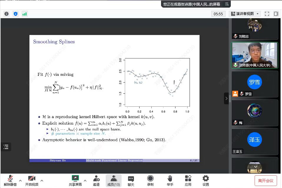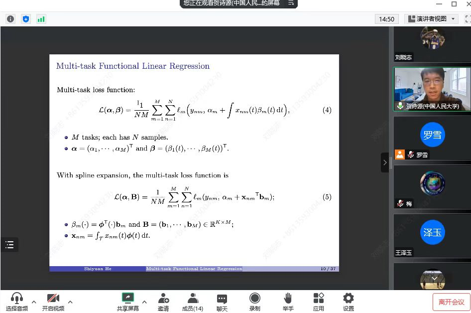 2022年11月18日,中国人民大学统计与大数据研究院贺诗源老师应罗雪老师的邀请,通过线上的方式为yl88858永利集团师生带来了一场题为“A Unified Analysis of Multi-task Functional Linear Regression Models with Manifold Constraint and Composite Quadratic Penalty”的学术报告。