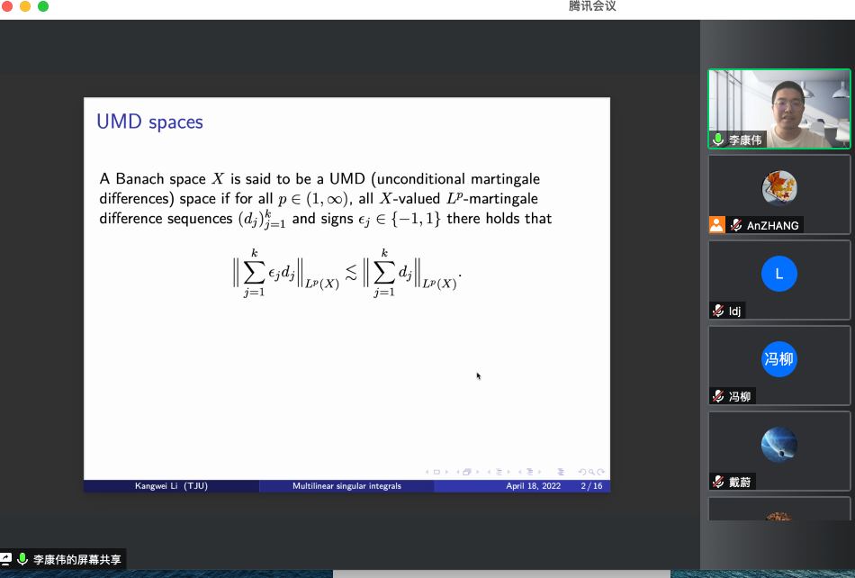 2022年04月18日,天津大学李康伟教授,应邀为yl88858永利集团师生做了题为 “UMD-valued extension of multilinear singular integrals”的学术报告,报告由张安老师主持。