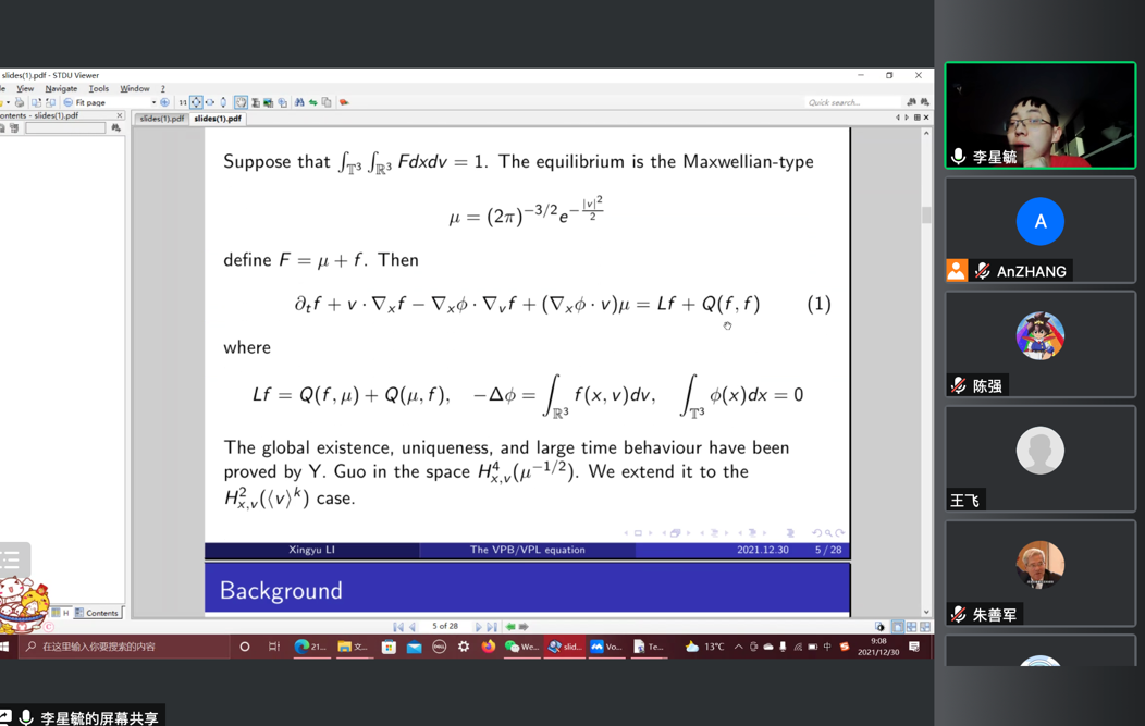 2021年12月30日下午,巴黎第九大学李星毓博士,应邀为yl88858永利集团师生做了题为 “The Vlasov-Poisson-Boltzmann/Landau equation with polynomial perturbation near Maxwellian”的学术报告,报告由任天一和张安老师主持。