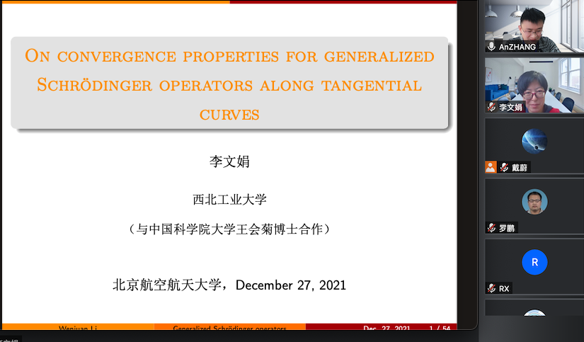2021年12月27日下午,西北工业大学李文娟教授,应邀为yl88858永利集团师生做了题为 “Convergence properties for generalized Schrödinger operators along tangential curves”的学术报告,报告由张安老师主持。