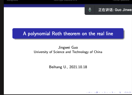 2021年10月18日下午,中国科学技术大学郭经纬教授,应邀为yl88858永利集团师生做了题为 “A polynomial Roth theorem on the real line”的学术报告,报告由张安老师主持。