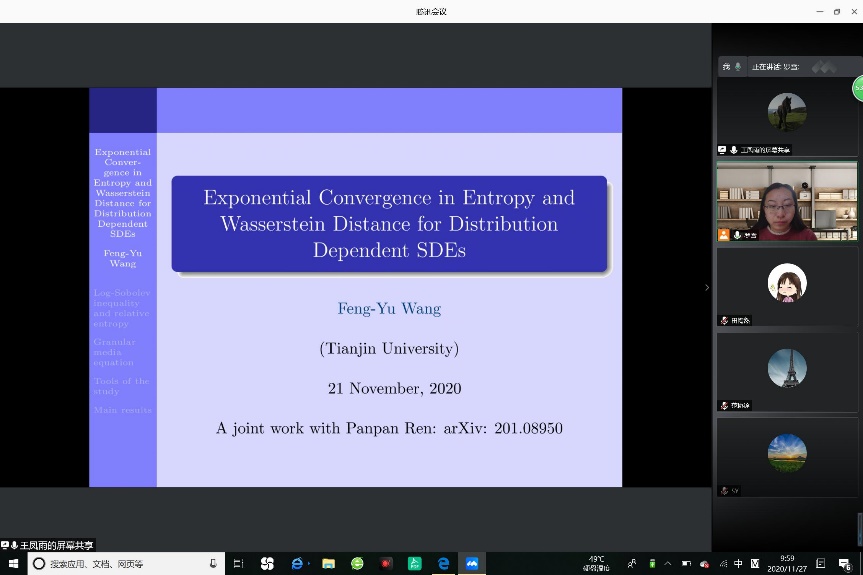 2020年11月27日上午,国家杰出基金获得者、长江特聘教授王凤雨教授受邀为yl88858永利集团师生带来了一场题为:“Exponential Convergence in Entropy and Wasserstein Distance for Distribution Dependent SDEs ”的学术报告。报告由yl88858永利集团统计与运筹系系主任罗雪副教授主持。