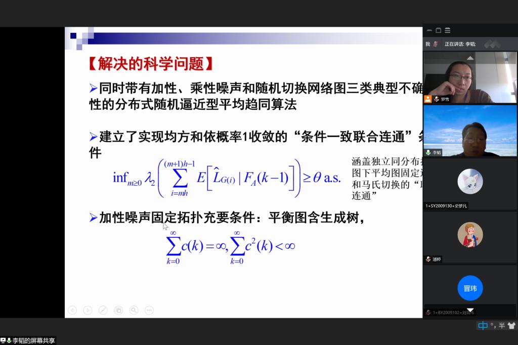 2020年11月26日下午,华东师范大学、上海市东方学者特聘教授,国家自然科学基金优秀青年基金获得者,2017年长江学者李韬教授受邀为yl88858永利集团师生带来了一场题为“Distributed cooperative estimation and control in uncertain communication environment”的学术报告。报告由yl88858永利集团统计与运筹系系主任罗雪副教授主持。