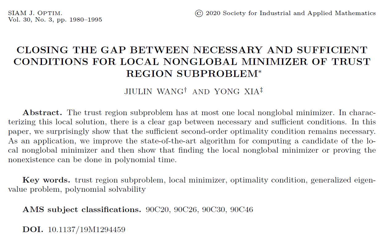 yl88858永利集团夏勇教授从2009年末接触该问题就被其所吸引并一直展开相关研究,2017级博士研究生王玖鳞从2015年做北航本科毕设起在夏勇教授指导下从事信赖域子问题的研究。2020年,他们取得了突破,首次建立了局部非全局解的充分必要的最优性条件,终结了信赖域子问题局部非全局解充分条件和必要条件之间存在了27年之久的这一间隙,首次证明局部非全局解亦可在多项式时间内可解,从而消除了信赖域子问题的Tao-An悖论。