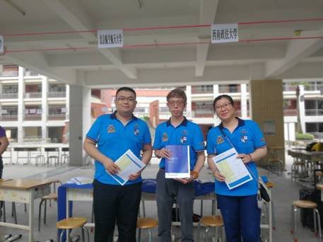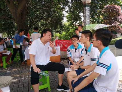 | 员工胡勇(中)帮助招生老师在广东实验中学做招生宣传 |