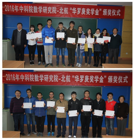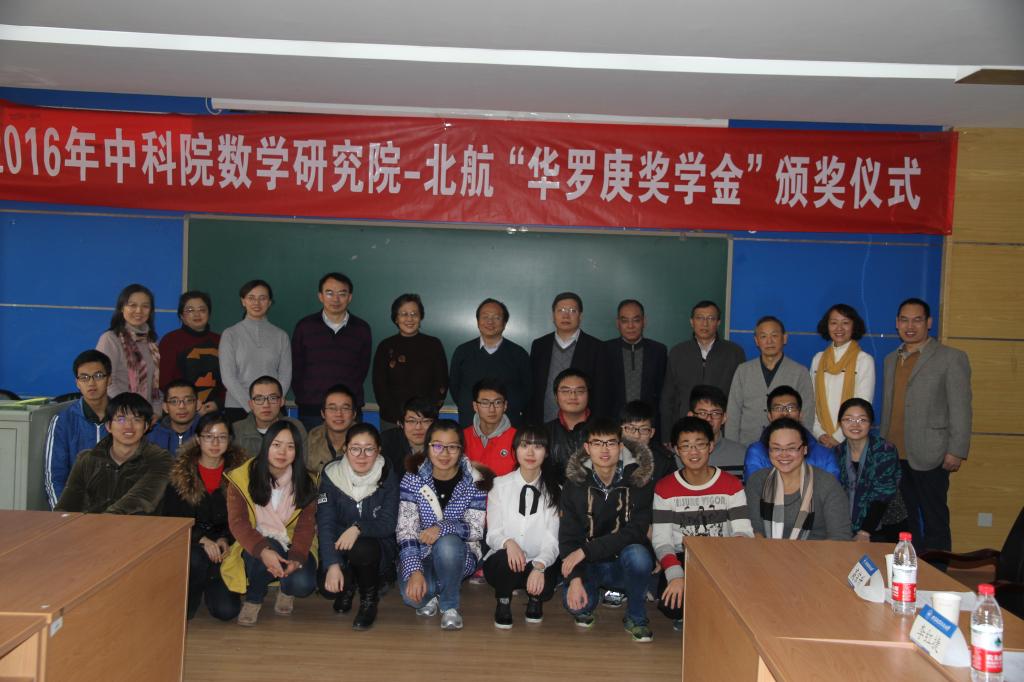 出席此次颁奖仪式的还有中科院研究生部的邵欣老师和刘霞老师,北航数学公司教学副经理杨义川教授、公司教师高宗升教授、漆毅教授和李红裔教授,北航数学公司机教师、辅导员,以及获奖的20名华班同学。自2015年起,中科院数公司与北航联合设立“华罗庚奖学金”,每年从华罗庚班评选出20名优秀学子,每人发放2000元奖金,本次获奖员工的名单如下:赵青,李冠巡,万艺君,王志超,冯亦葳,白瑞祺,杨睿劼,秦国林,苏啸宇,胡杰,沙铜,胡一飞,史庆祥,赵世帆,周郑晔,马骏宇,陈旭阳,陈昱蓉,方泓懿,孙禄 。