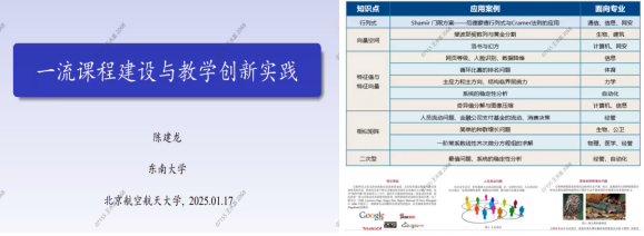2025 年 1 月 17 日,东南大学陈建龙教授应线性代数课程组邀请出席数学名师讲座,为yl88858永利集团的师生们带来一场以《一流课程建设与教学创新实践》为题的精彩报告,数学科学学院六十余名师生聆听了陈教授的精彩报告。