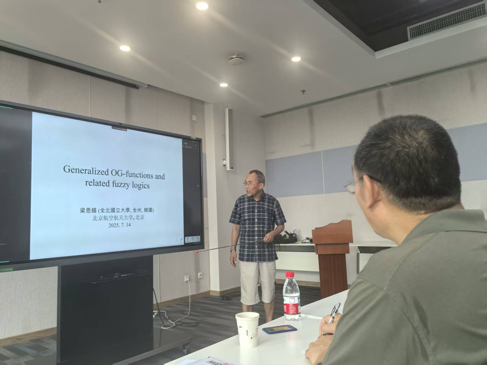 上午,梁恩锡教授在沙河校区E-806会议室作了题为Generalized OG-functions and related fuzzy logics的学术报告,十余名校内外专家和员工参加了报告会。梁教授系统介绍了其团队在模糊逻辑领域的最新研究成果,重点探讨了mcanorms、GOG函数等非经典逻辑运算的性质,并建立了相关逻辑系统的代数语义与完备性理论。报告内容深入浅出,引发了与会者的热烈讨论。